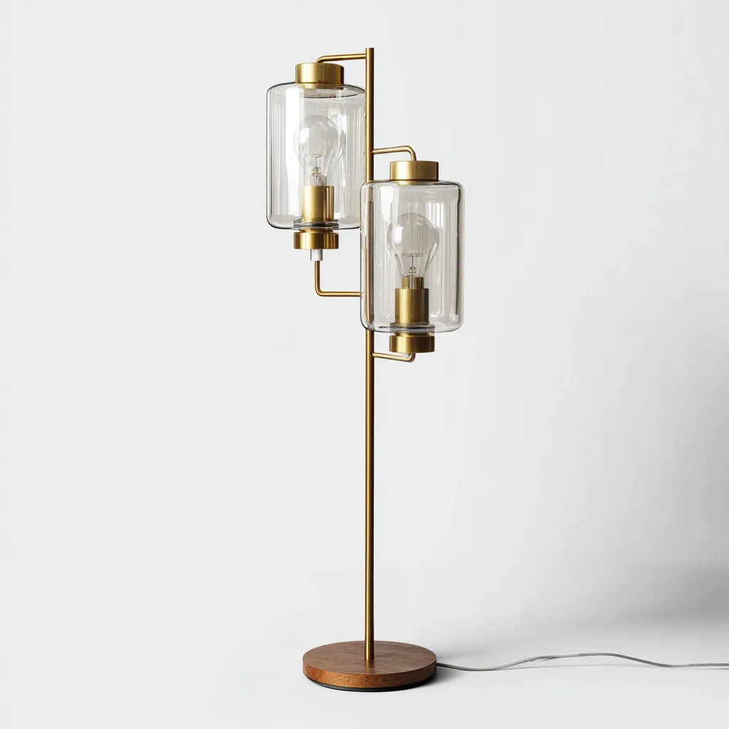Elegancka lampa podłogowa wykonana z połączenia metalu, szkła i drewna to doskonały element oświetleniowy do nowoczesnych wnętrz. Jej unikalna konstrukcja z dwoma kloszami w transparentnym szkle nadaje przestrzeni stylowy charakter i przyjemne, ciepłe światło.