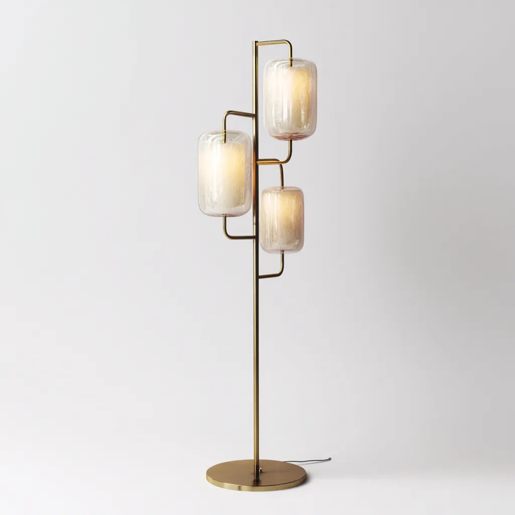 Nowoczesna lampa podłogowa o eleganckim wyglądzie łączy w sobie szkło i metal, tworząc wyjątkowy element dekoracyjny do wnętrz. Trzy mleczne klosze rozmieszczone na różnych wysokościach zapewniają nastrojowe i równomierne oświetlenie, idealne do salonu lub sypialni.