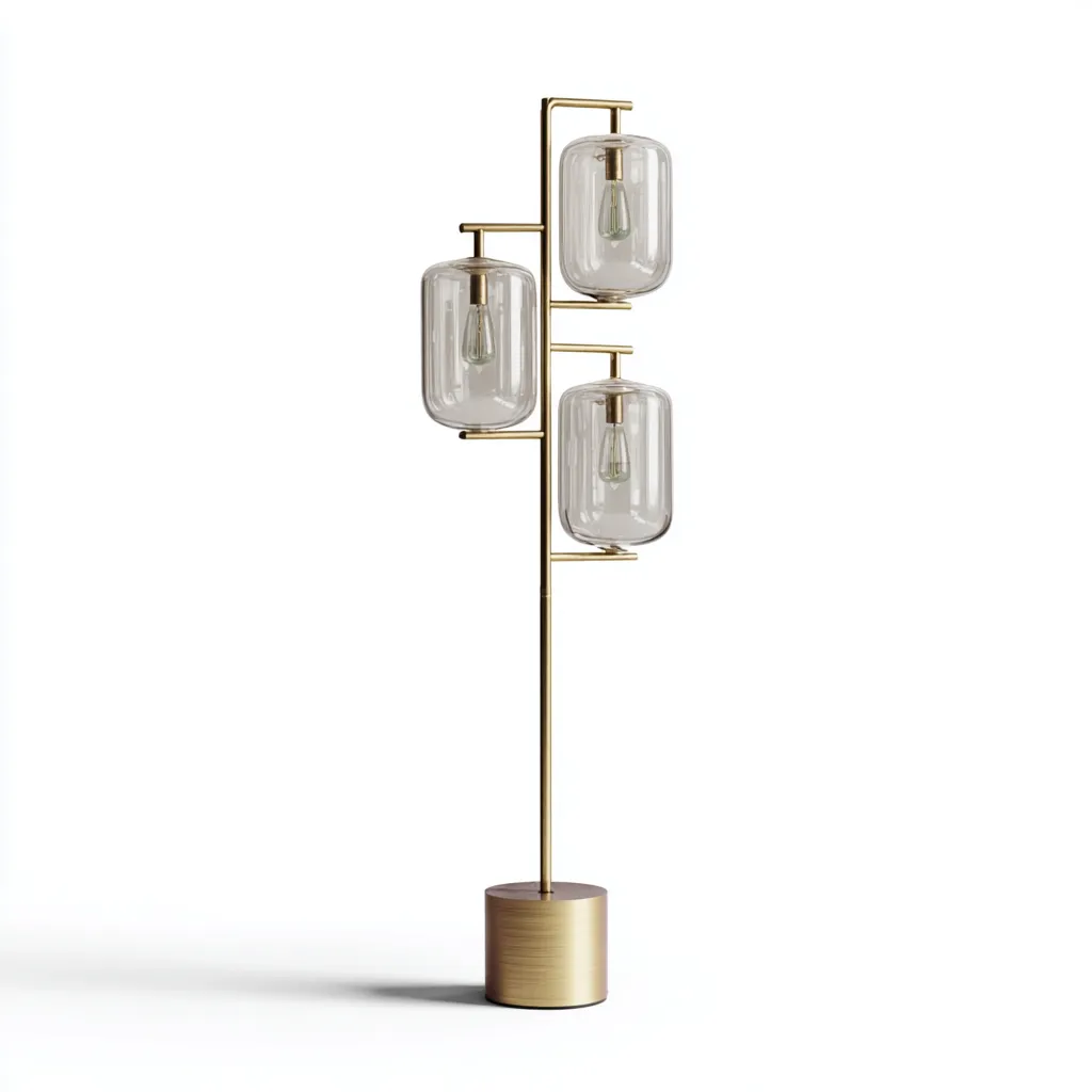 Nowoczesna lampa podłogowa o eleganckiej formie, wykonana z połączenia metalu i szkła, to doskonały wybór do salonu lub biura. Trzy szklane klosze rozmieszczone na różnych wysokościach tworzą efektowną kompozycję świetlną, nadając wnętrzu wyjątkowy charakter.