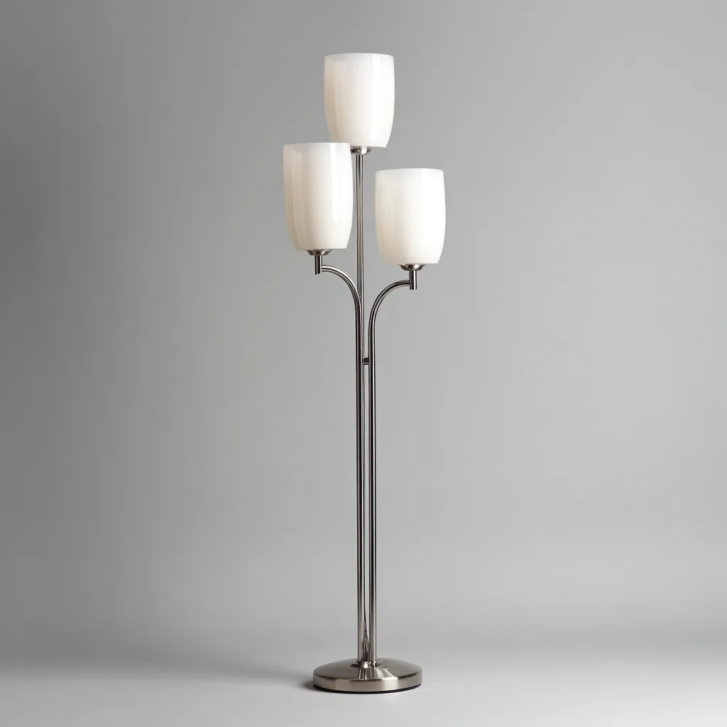 Nowoczesna lampa podłogowa o eleganckim wyglądzie stanowi doskonałe uzupełnienie współczesnych wnętrz. Trzy szklane klosze w białym kolorze zapewniają miękkie, rozproszone światło, które tworzy przytulną atmosferę w salonie lub sypialni.