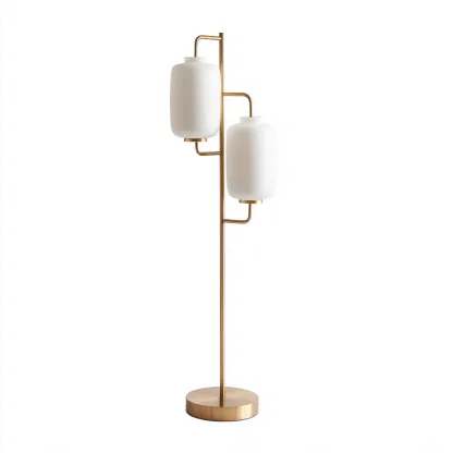 Nowoczesna lampa podłogowa o minimalistycznym charakterze łączy prostotę formy z eleganckim wykończeniem. Dwa mlecznobiałe szklane klosze rozpraszają ciepłe światło, wprowadzając do wnętrza przyjemną atmosferę relaksu i spokoju. Idealna do salonu, sypialni lub biura.