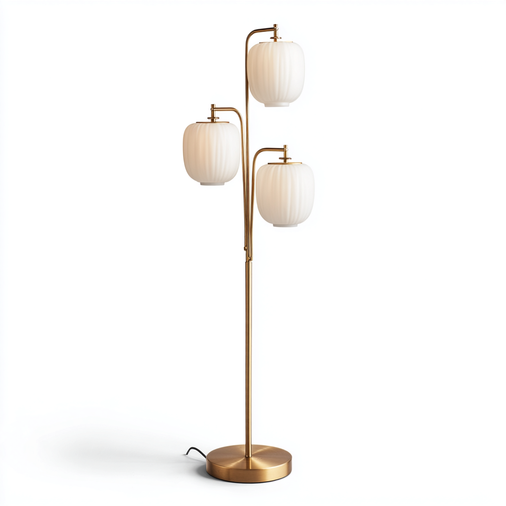 Elegancka lampa podłogowa w nowoczesnym stylu to połączenie funkcjonalności i estetyki. Trzy mlecznobiałe, żłobione szklane klosze rozpraszają miękkie światło, tworząc przytulny nastrój. Idealnie sprawdzi się jako oświetlenie do salonu, sypialni lub gabinetu.