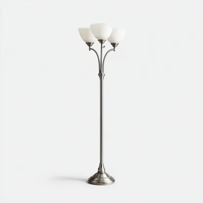 Klasyczna lampa podłogowa w satynowym odcieniu srebra to eleganckie rozwiązanie oświetleniowe, które doda wnętrzu szyku i harmonii. Trzy białe, kielichowate klosze rozpraszają światło w sposób równomierny, tworząc przyjemną atmosferę w salonie, sypialni lub gabinecie.