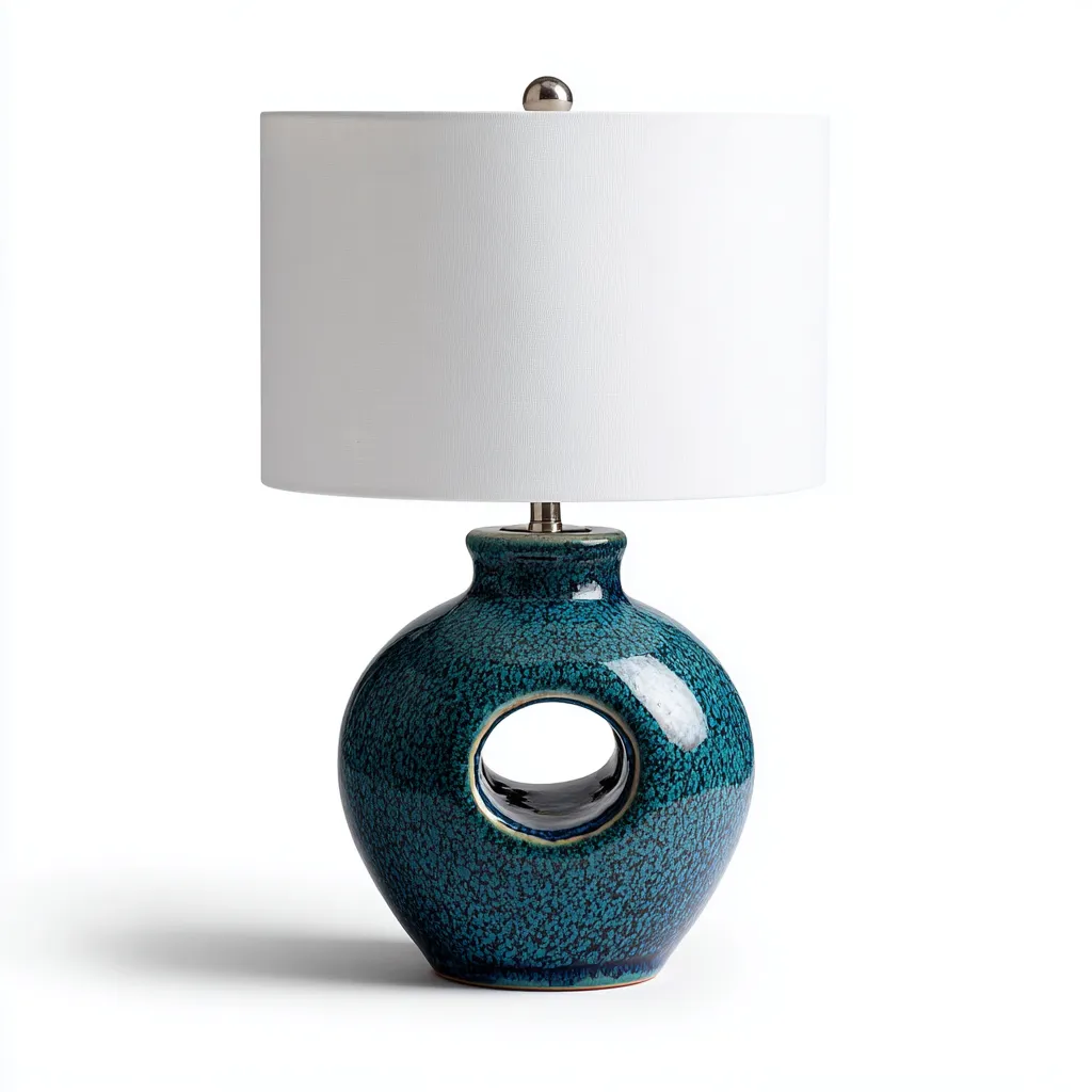 Nowoczesna lampa stołowa o wyjątkowej formie wykonana z ceramiki w odcieniu ciemnego turkusu to stylowy element wystroju każdego wnętrza. Dzięki harmonijnemu połączeniu błyszczącej ceramicznej podstawy z białym abażurem, lampa doskonale wpasowuje się zarówno w eleganckie, jak i minimalistyczne aranżacje. Idealna do salonu, sypialni lub gabinetu.