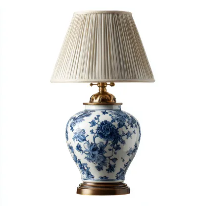 Elegancka porcelanowa lampa stołowa w klasycznym stylu orientalnym to połączenie tradycji i luksusu. Niebiesko-biały wzór kwiatowy na porcelanowym korpusie oraz plisowany kremowy abażur nadają wnętrzu wyrafinowany charakter. Idealna do salonu, sypialni lub gabinetu.
