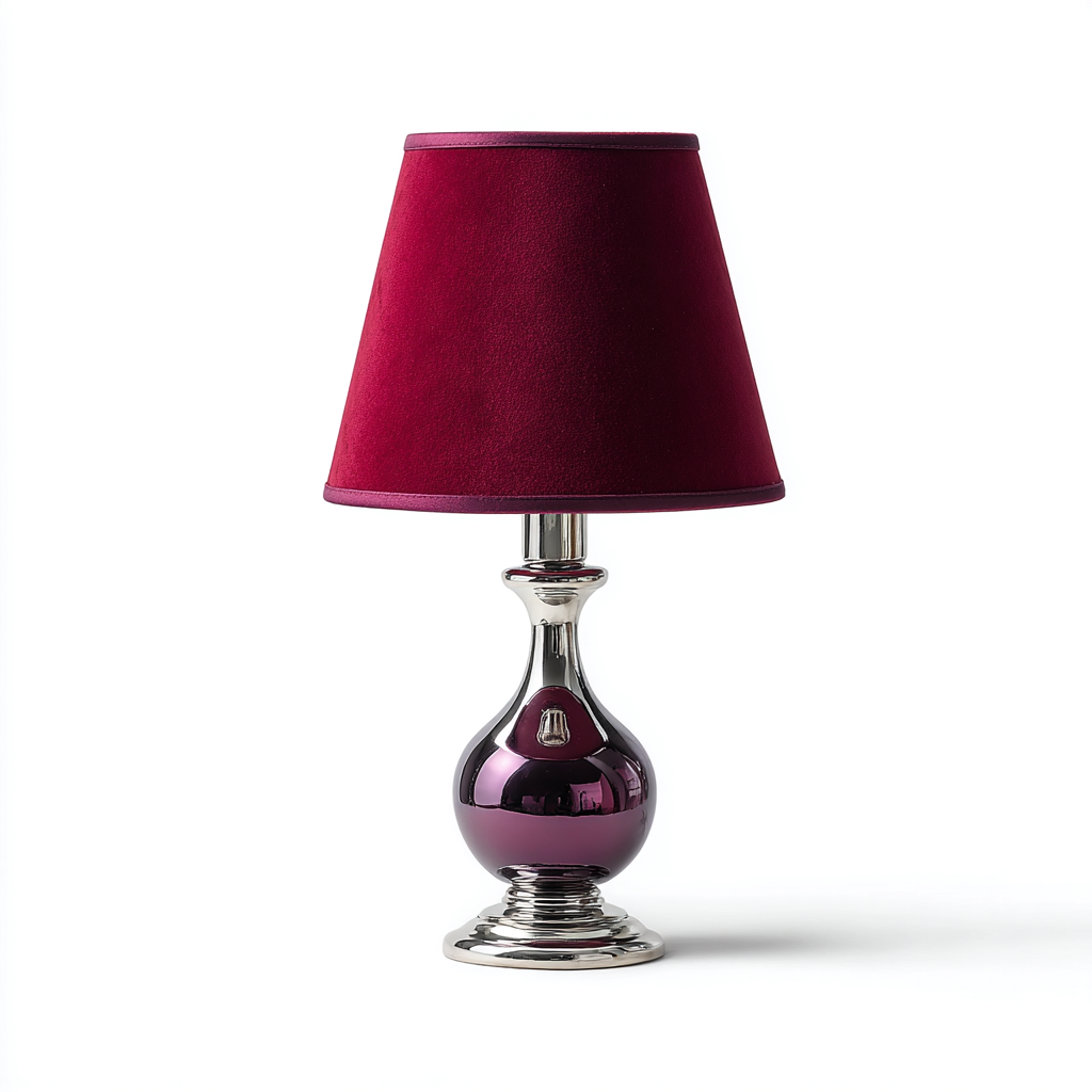 Elegancka lampa stołowa o klasycznej formie i subtelnym połysku to idealne rozwiązanie dla osób ceniących styl i jakość. Bordowy welurowy abażur w połączeniu z metaliczną srebrną podstawą tworzy efektowny kontrast, który dodaje wnętrzu charakteru.