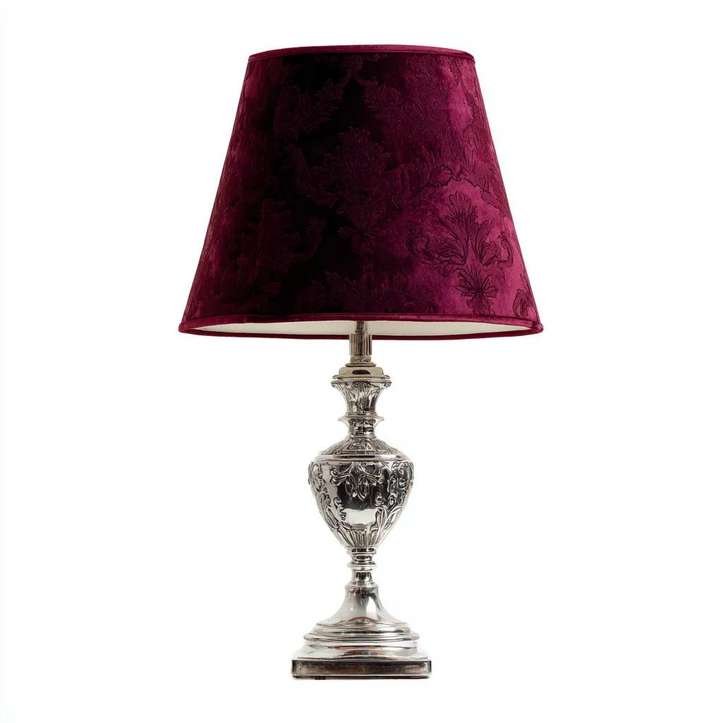 Lampa posiada solidną metalową podstawę o srebrnym połysku oraz abażur wykonany z wysokiej jakości weluru w kolorze bordowym. Starannie tłoczone zdobienia dodają jej klasy i elegancji.
