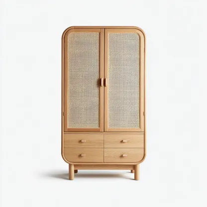 Stylowa szafa 2-drzwiowa z czterema dolnymi szufladami to harmonijne połączenie naturalnego drewna i rattanu. Jej zaokrąglone krawędzie oraz lekka forma wprowadzają do wnętrza ciepło i przytulność charakterystyczne dla stylu boho.